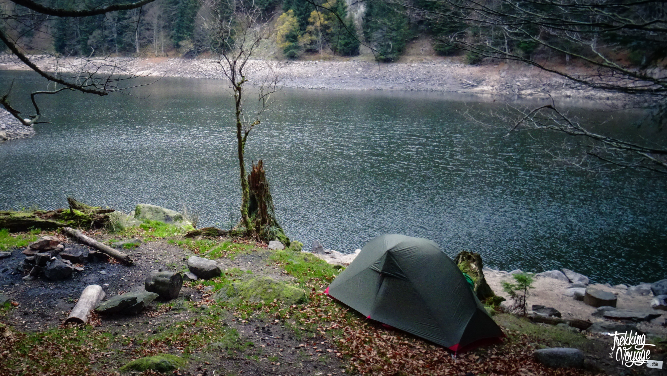 Ce petit lac dispose d’un coin en bordure de celui-ci aménagé par des randonneurs pour y installer une ou deux tentes. Nous profitons donc du confort et de la beauté de l’endroit pour nous y installer, à quelques pas du sentier.