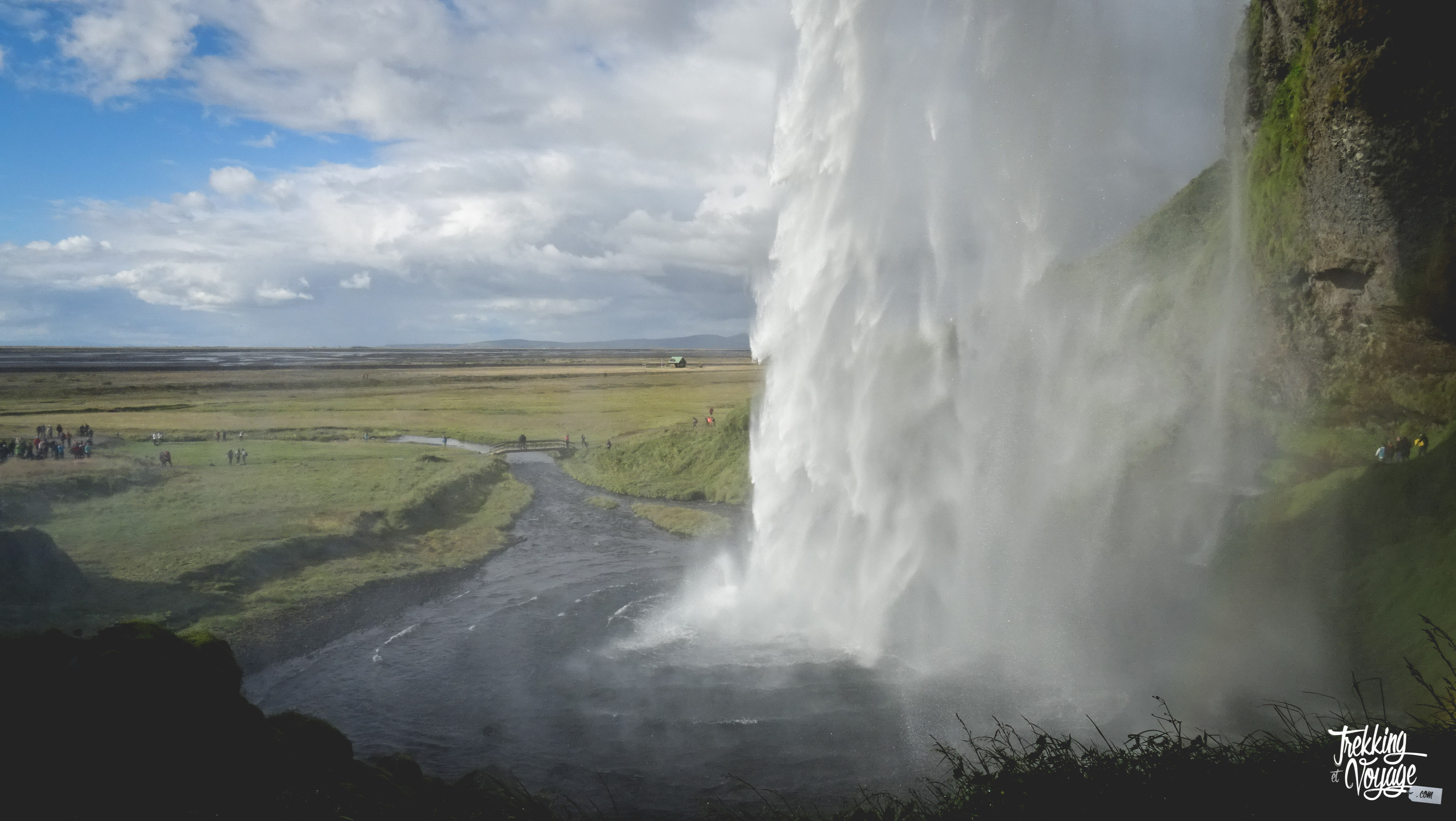 Nous terminons la journée avec une halte à la cascade Seljalandfoss, située au pied du célèbre Eyjafjallajökull.