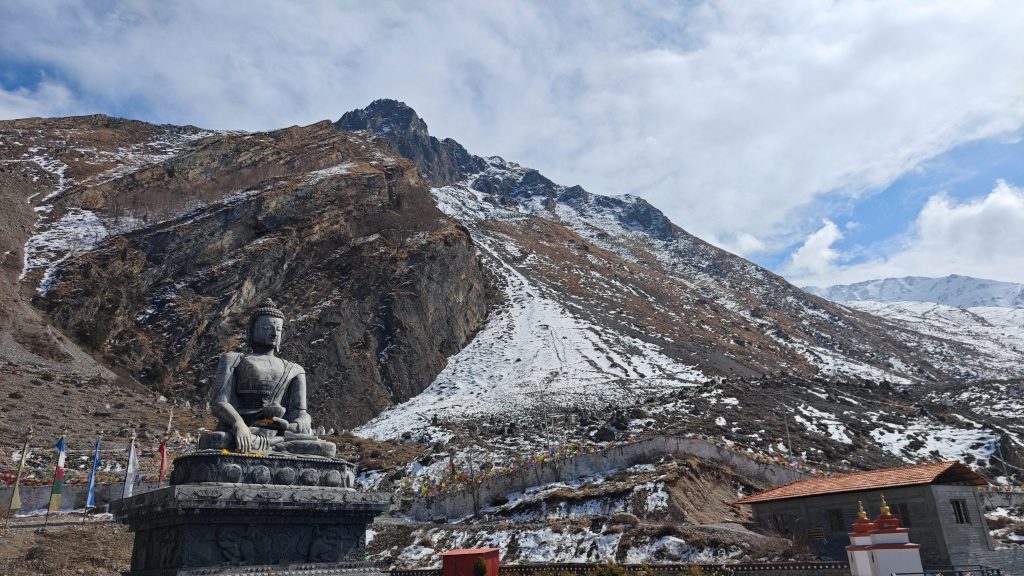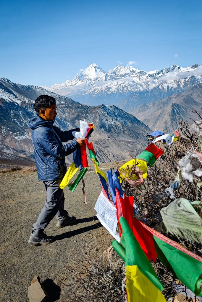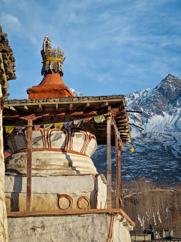 D’abord la découverte d’un temple bouddhiste sur les hauteurs de Marpha. On y monte à pied, en prenant un peu de hauteur sur le village, et soudain l’ambiance change complètement. Le lieu est calme, presque suspendu, chargé d’une atmosphère spirituelle marquante. Un contraste saisissant avec l’effervescence des visiteurs népalais venus nombreux visiter dans cet endroit qu’ils aiment profondément.
