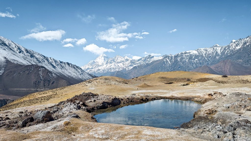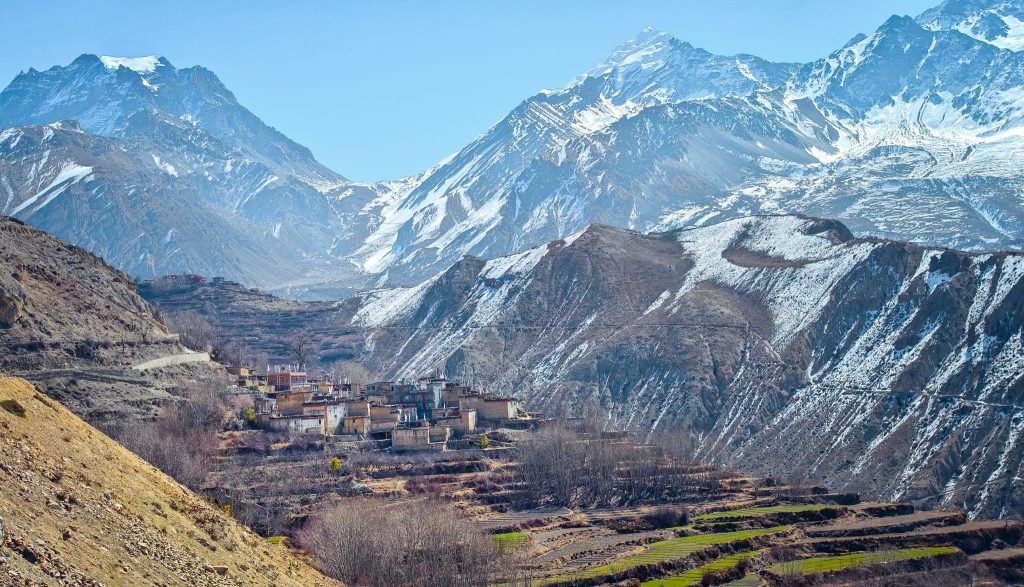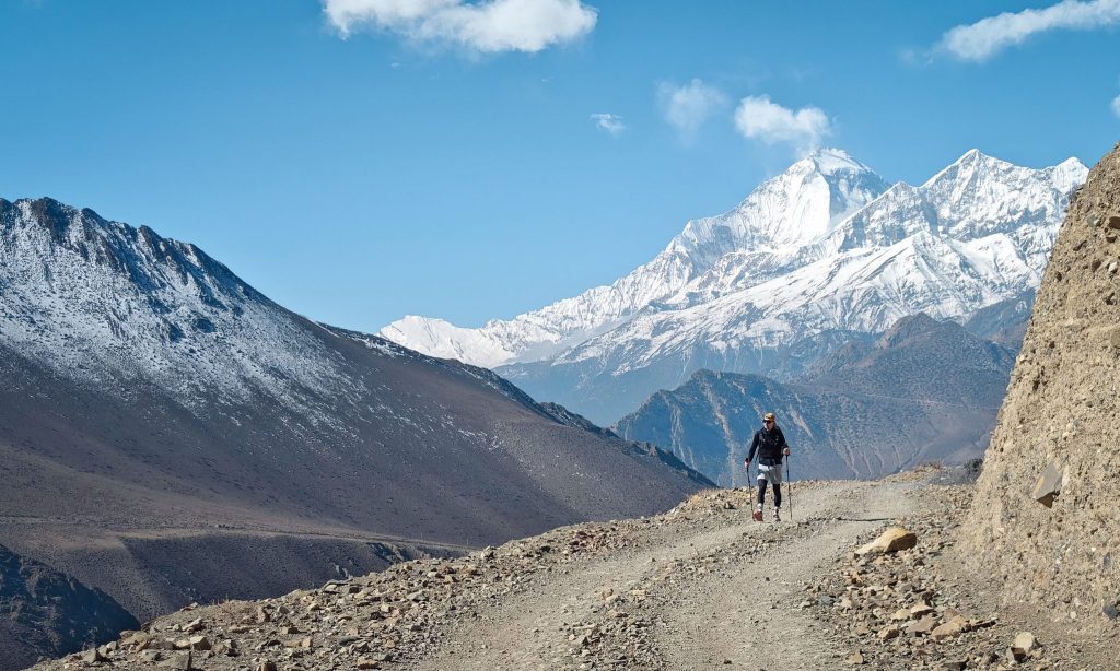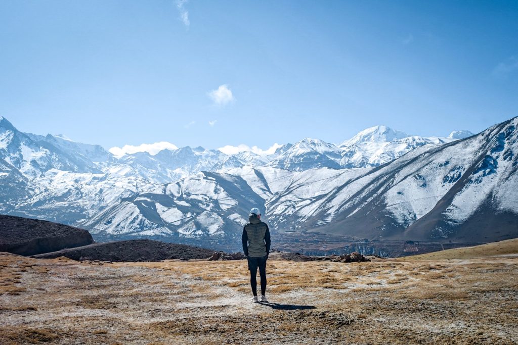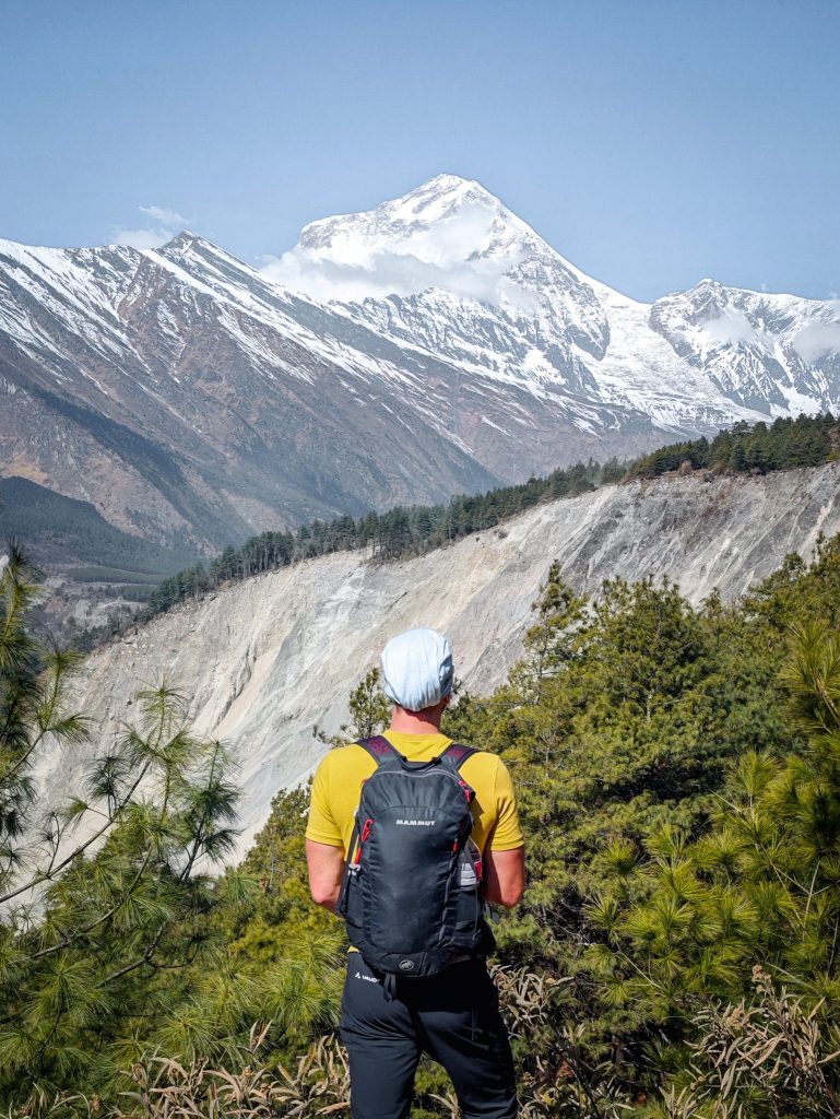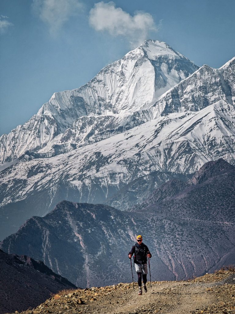 Je ne vais pas te raconter le trek jour après jour car j’ai envie de te laisser une part de surprise. Mais dès les premiers jours de marche, le paysage change déjà. Les forêts disparaissent peu à peu et laissent place à des reliefs plus arides. Les villages se font plus rares, les maisons de pierre semblent s’accrocher aux pentes. Et puis il y a ces moments où l’on lève les yeux et où apparaît le Dhaulagiri, immense pyramide de glace culminant à plus de 8000 mètres.