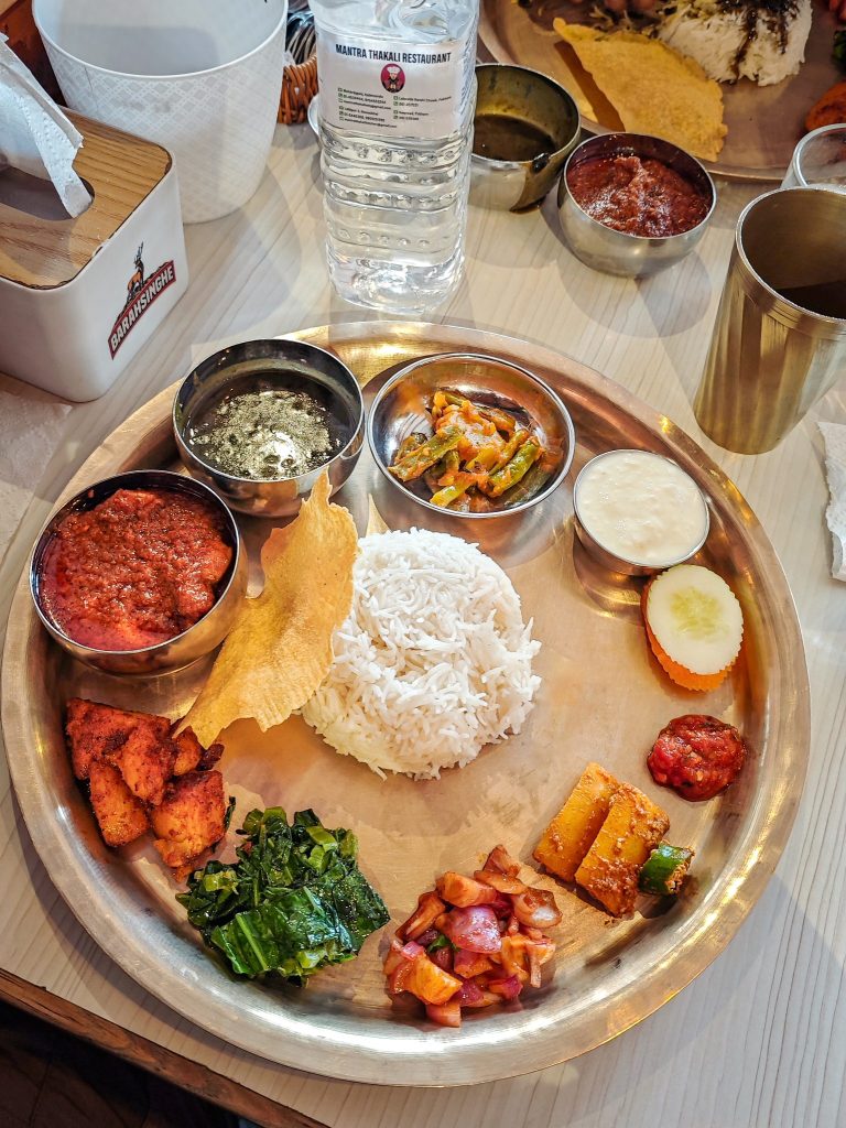 Je découvre ensuite la cuisine Thakali. Cette communauté originaire de la région du Mustang est réputée dans tout le pays pour son savoir-faire culinaire. Leur plat emblématique, le dal bhat thakali, se compose de riz, de lentilles, de légumes, de pickles et parfois de viande ou de yaourt. C’est simple, nourrissant et parfaitement équilibré.