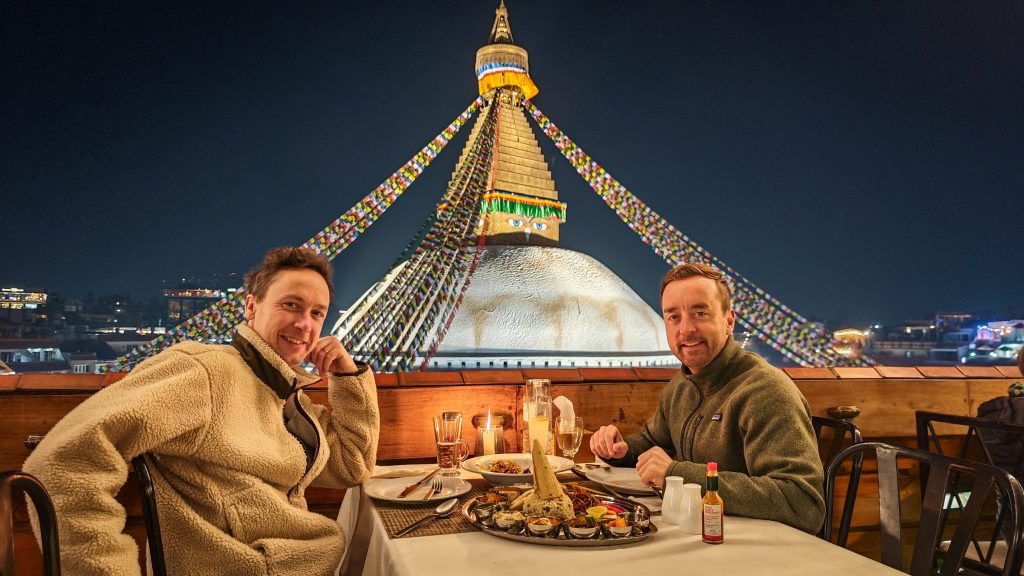 On commence donc l’expérience par un dîner de bienvenue dans un cadre unique face à la stupa. Une belle manière de poser un premier pas dans l’univers gastronomique népalais, une cuisine riche et variée, à l’image du pays et des nombreuses ethnies qui composent le Népal.