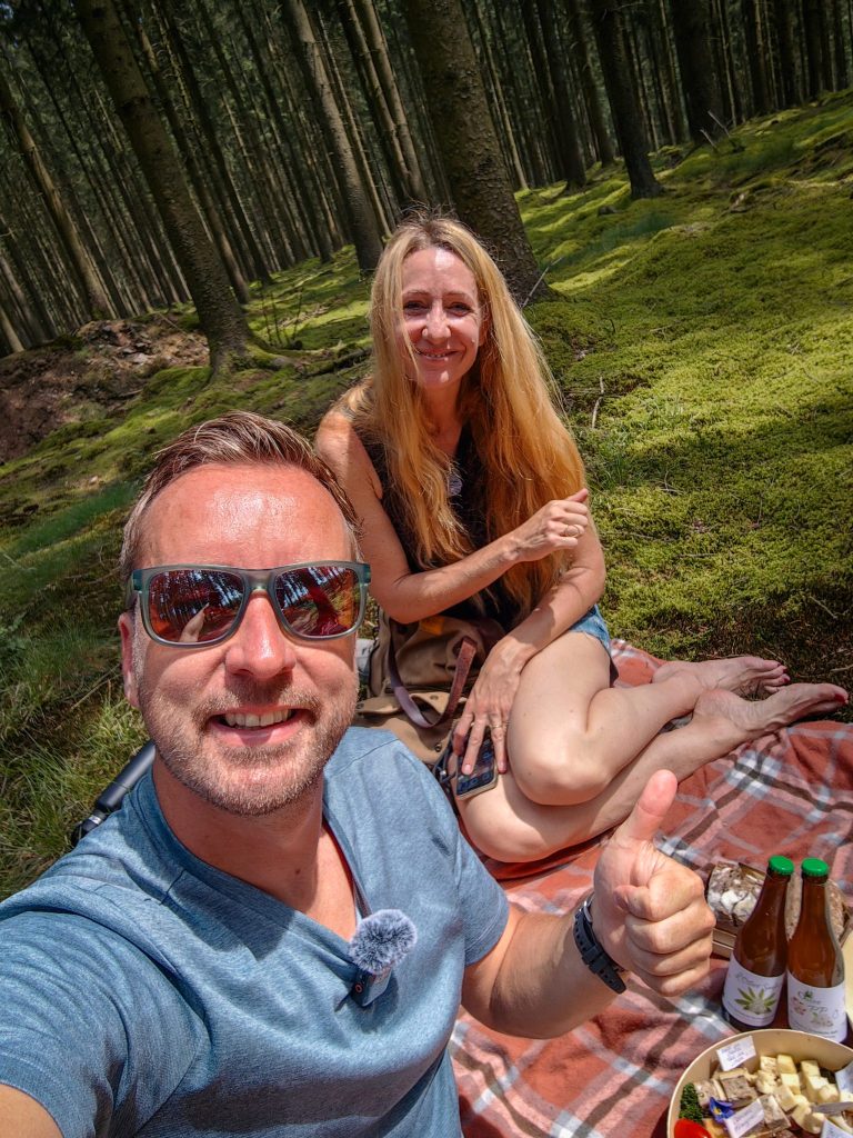 On arrive déjà à la moitié de l’itinéraire et on trouve un coin d’ombre dans une sapinière. La chaleur retombe un peu… On étale une couverture, on s’installe. Caroline sort deux bières et un plateau de dégustation… Je suis ravi !