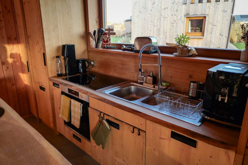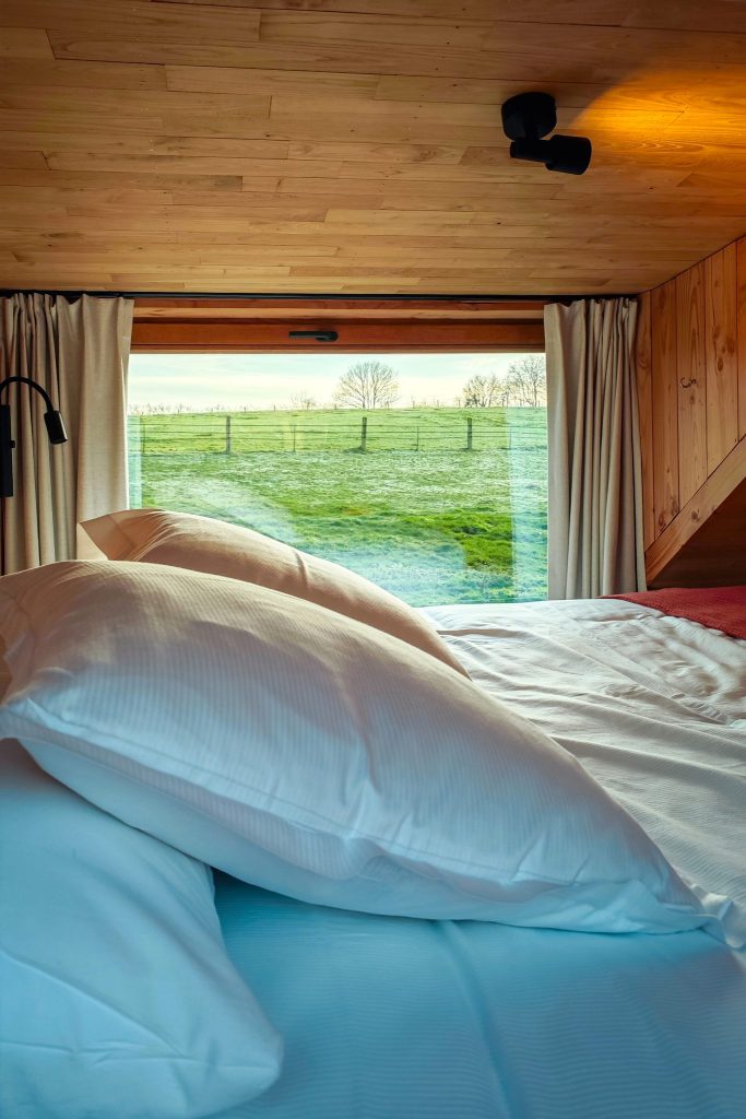Rien de superflu, mais j’y ai trouvé une vraie cohérence : chaque élément invite à habiter l’espace plutôt qu’à simplement y passer. Et surtout, il ne manque rien. À l’arrivée, tout est déjà prêt : les lits sont faits avec une literie ultra confortable, des essuies de bain sont à disposition, et la cuisine est bien équipée : taque de cuisson, mini four, poeles et casserolles, café, thé, huile, sel, poivre et sucre. On trouve également du savon pour les mains et du gel douche respectueux de la peau et de la nature, ainsi que tout le nécessaire pour la vaisselle : liquide vaisselle, éponge, essuie-vaisselle et une vaisselle complète en quantité suffisante. Il ne reste plus qu’à poser ses affaires et profiter !