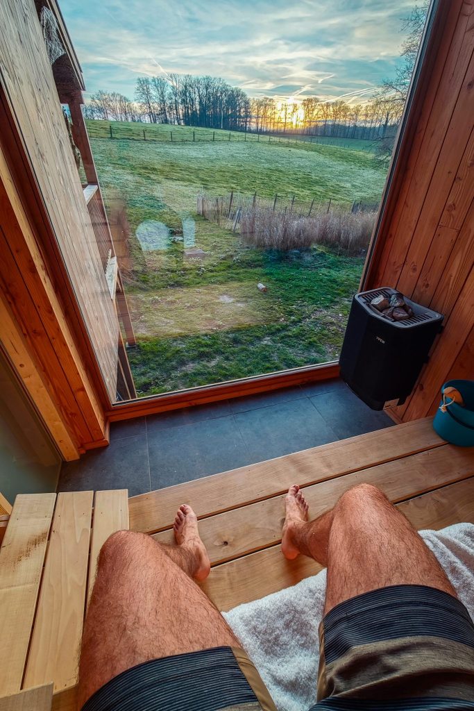 Au-delà des cabanes, le Domaine propose un espace commun baptisé le Foyer. C’est le coin discret du site et mon coup de coeur : un lieu de rencontre et de partage, où l’on retrouve une cuisine commune, des grandes tablées, des jeux de société, un poêle à bois et un sauna avec vue sur la nature. Rien que ça…