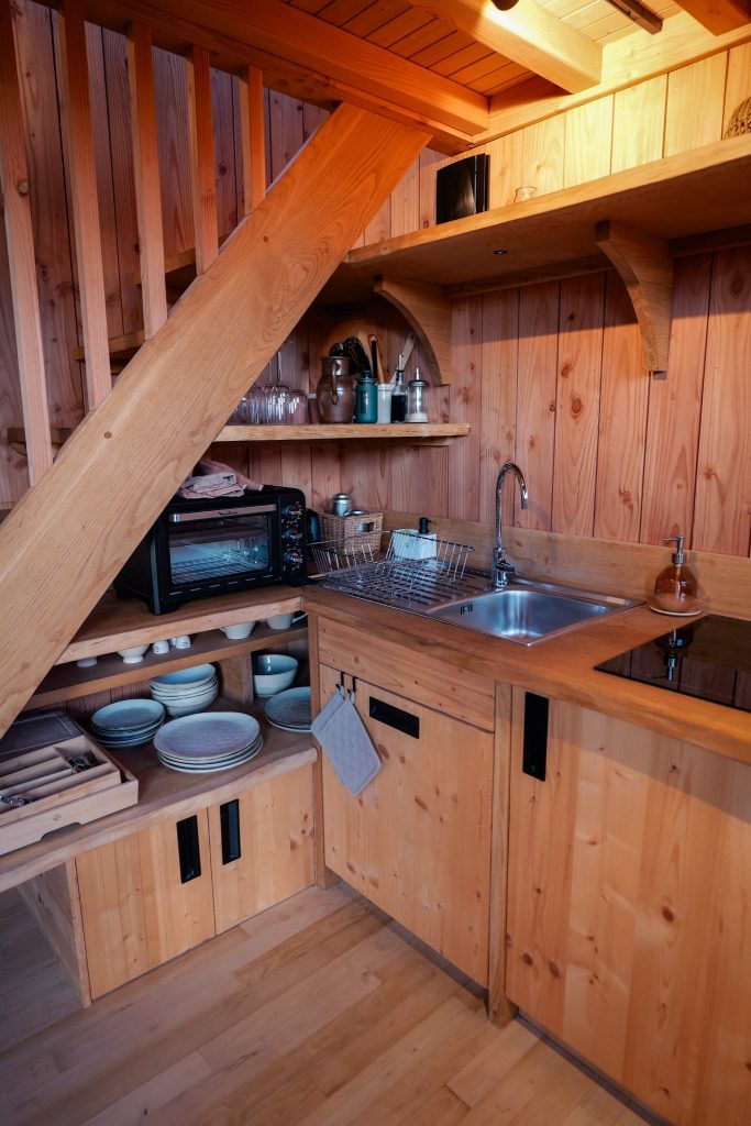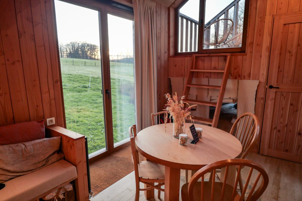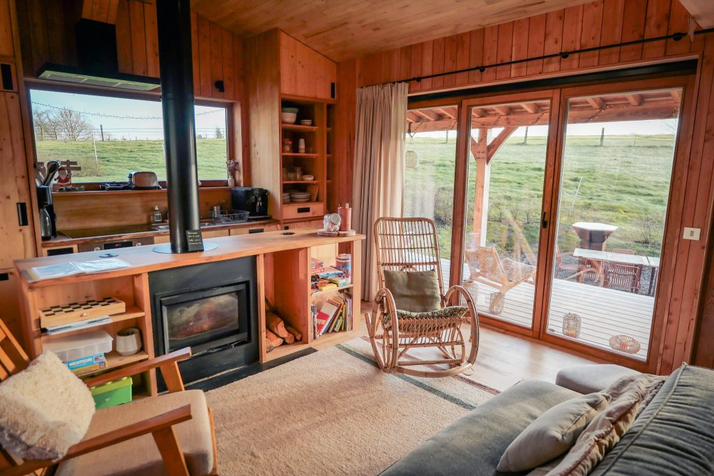 Chaque cabane (conçue par des artisans de la région) se présente comme un cocon en bois, chaleureux sans être rustique, fonctionnel sans être froid. L’aménagement va à l’essentiel, avec ce qu’il faut pour être autonome tout en gardant une vraie sensation de confort :