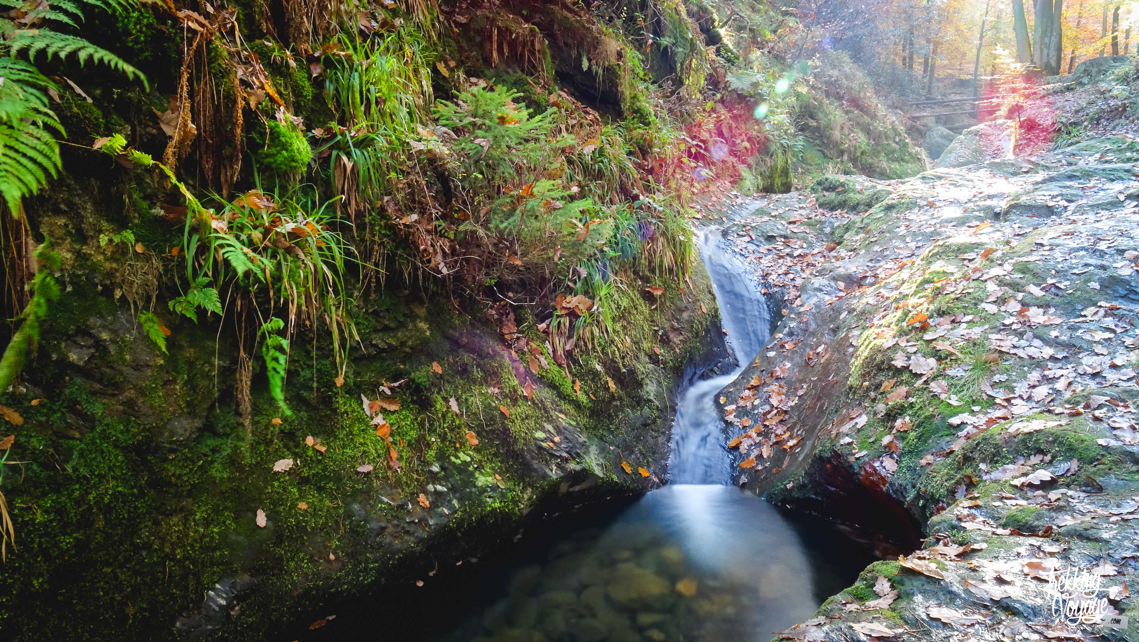 Certain affirment qu’il est préférable de faire l’itinéraire dans l’autre sens pour profiter des jolies vue sur les cascades du Ninglinspo qui se laissent découvrir pas à pas… Pourquoi pas, mais je n’ai cependant pas regretté ce choix. Dès le début, on pénètre dans un milieu agréable par un chemin forestier saupoudré de rayons de soleils matinaux enchanteurs…